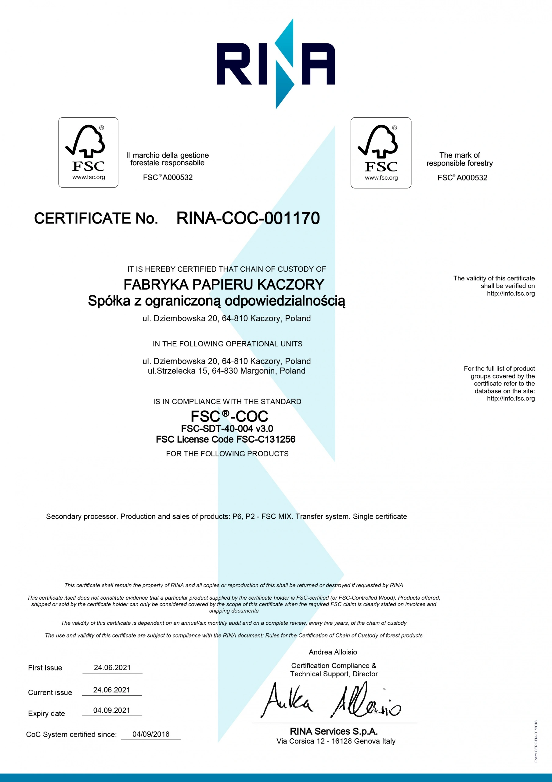 Die PAPIERFABRIK KACZORY kann sich vieler Zertifikate und Auszeichnungen rühmen, die die hohe Qualität ihrer Produkte bestätigen.